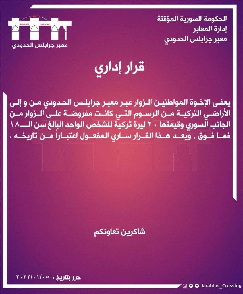 قرار جديد من ادارة معبر جرابلس الحدودي بخصوص الاخوة السوريين، والداخلين عبر بوابة قرقميش سواء اصحاب اجازات العيد المقبلة او […]