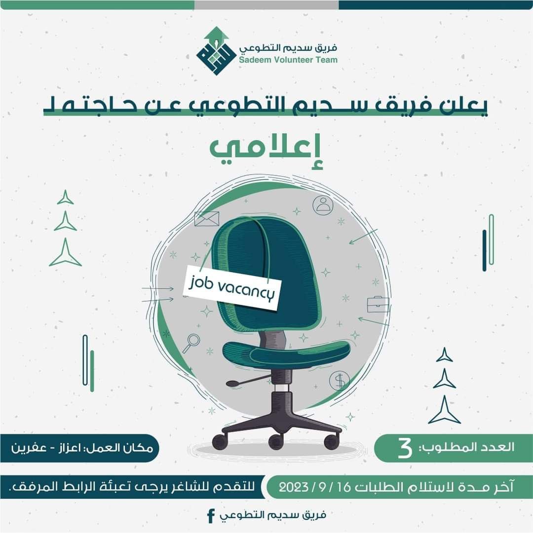 يعلن فريق سديم التطوعي عن حاجته ل (إعلامي) لكلٍ من عفرين واعزاز