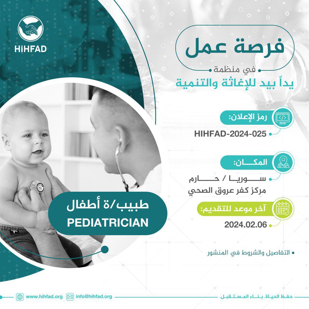 تعلن منظمة يداً بيد للإغاثة والتنمية عن حاجتها لتعيين طبيب/ة أطفال في سوريا / حارم – مركز كفر عروق الصحي.